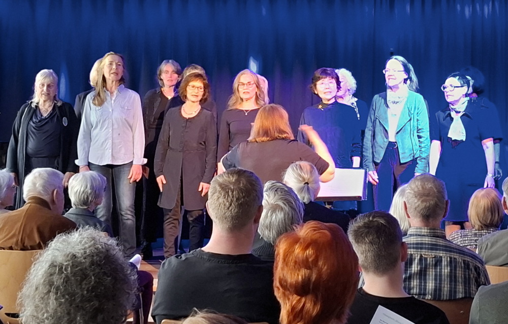 Samstag, 11. April 2026, 17.30 Uhr. Das Eschborn K ist rappelvoll, sogar auf der Empore sitzen Leute. Von dort – also gewissermaßen „aus dem Off“ und unsichtbar für die meisten Gäste – stimmen wir mit 21 Sängerinnen das erste Lied des Konzerts an: Abend wird es wieder. Dann folgt ein eklatanter musikalischer Themenwechsel. Gisèle Kremer spielt am Flügel Improvisationen über Lieder der Nacht, während wir, die singfonie Ladies, und Bettina Kaspary, unsere Chorleiterin, die „Showtreppe“ herunterkommen und die in blaues Licht getauchte Bühne betreten.